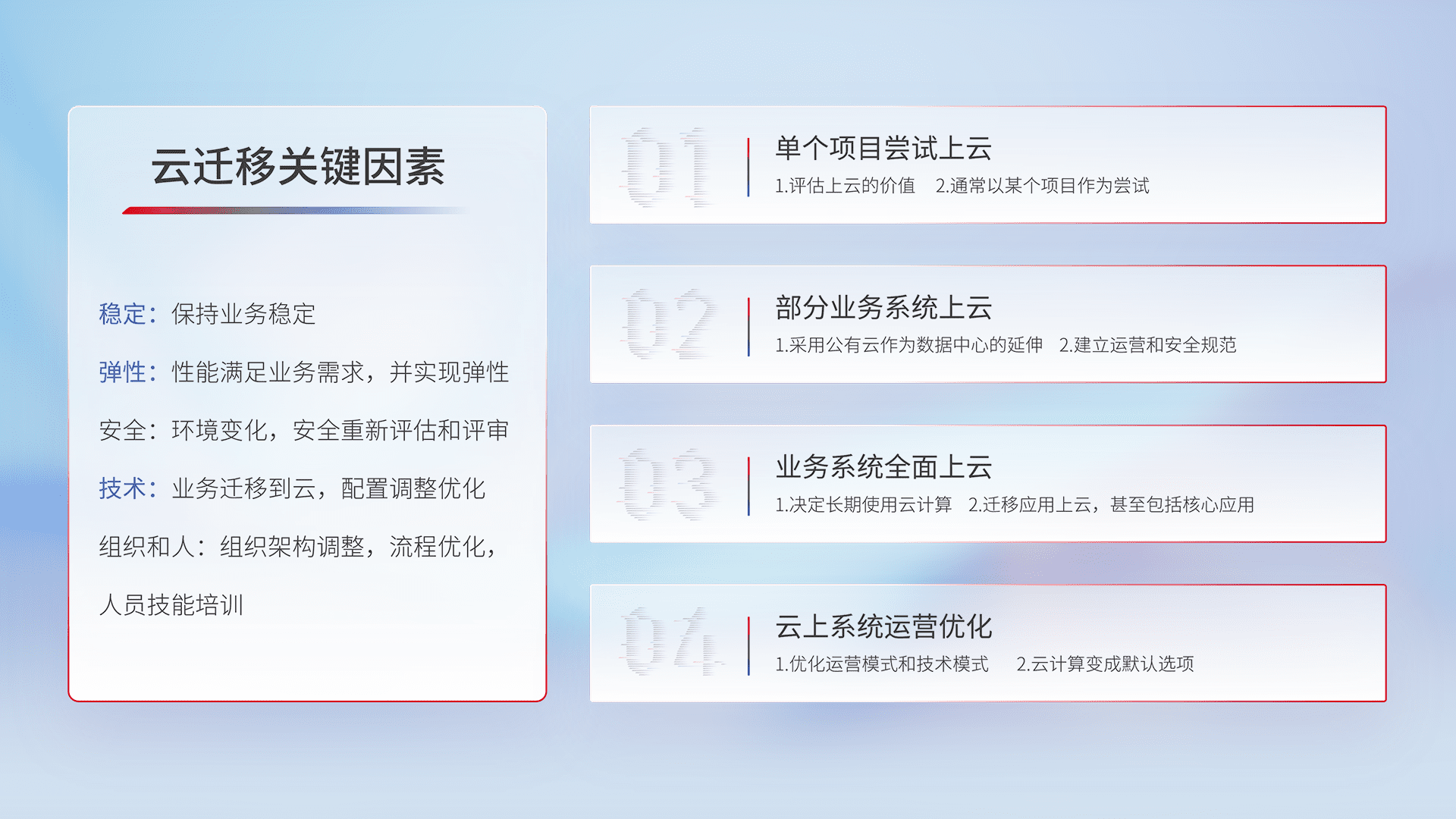结合实际业务,,,从规划设计、、云平台选型、、、、云原生改造、、、、数据迁移、、、集成交付,,迁移全过程为客户识别最佳上云路径,,,,做好风险识别管理,,,设计网络架构、、身份权限、、、安全审计合规、、、操作审计、、日志审计、、监控告警策略、、、多站点容灾设计等,,,对云上基础设施进行整体规划,,,提升IT治理水平,,以满足弹性、、高可用、、、高性能的需求。。。