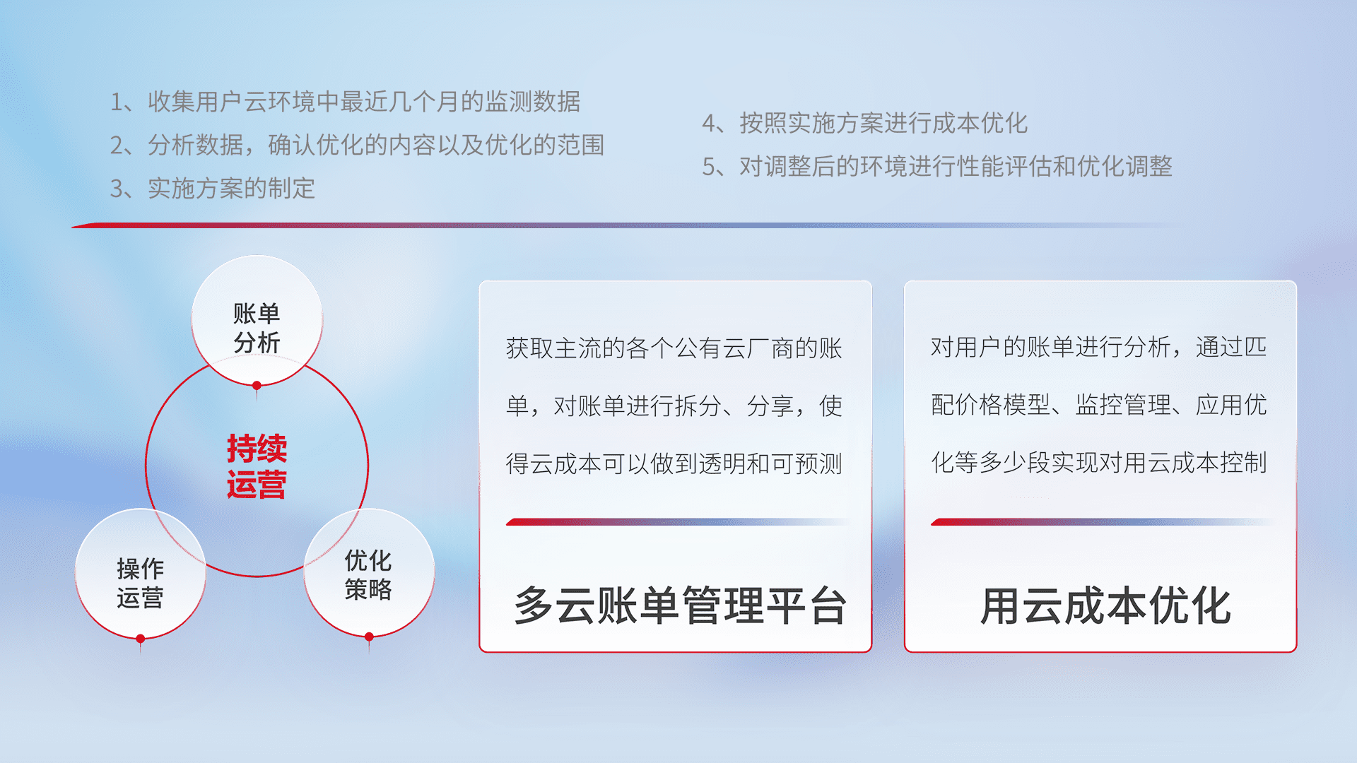 通过多云纳管,,,以统一的资源数据模型把客户的云资源进行抽象和封装,,,进而实现对多云资源的统一操作,,,保障云资源管理的可靠性、、、、稳定性与可用性。。量身定制化运维内容,,,,配置、、开发运维、、补丁管理、、、、备份、、、、监控、、、认证和访问管理、、审计和日常巡检等,,保障在用云过程中的可靠度,,稳定度以及高可用率。。